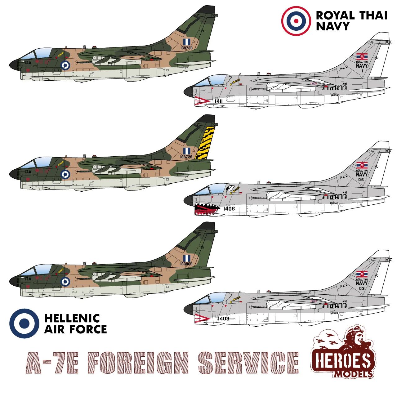 Screenprint decals for three planes in 1/144 scale to represent the A-7E Corsair II that flew in the Hellenic Air Force and Royal Thai Navy.