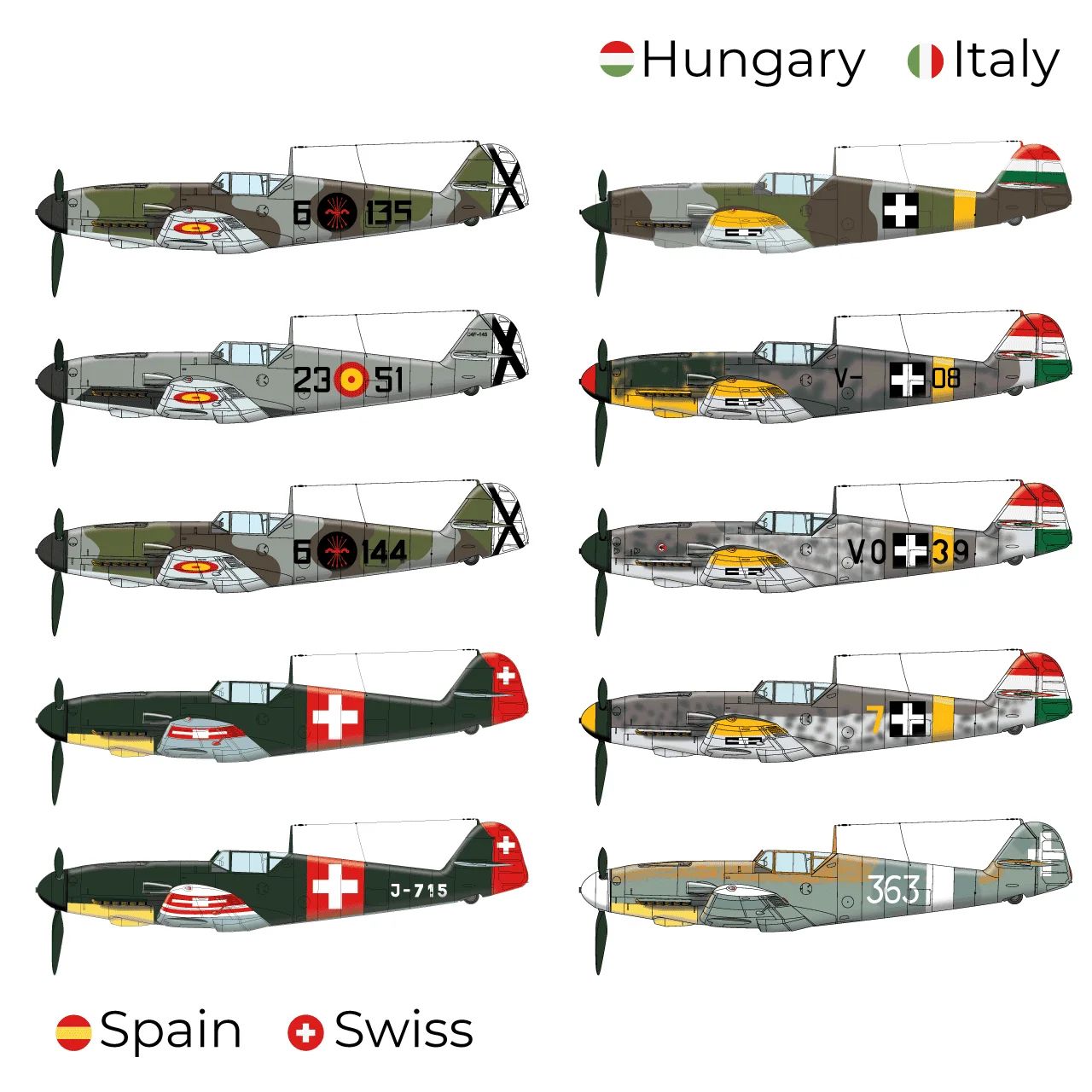 A selection of ten Bf-109F’s used by non German operators. High quality silk printed waterslide decals sheet and a colorful instruction sheet with historical notes, coloring tips and colors suggestions.